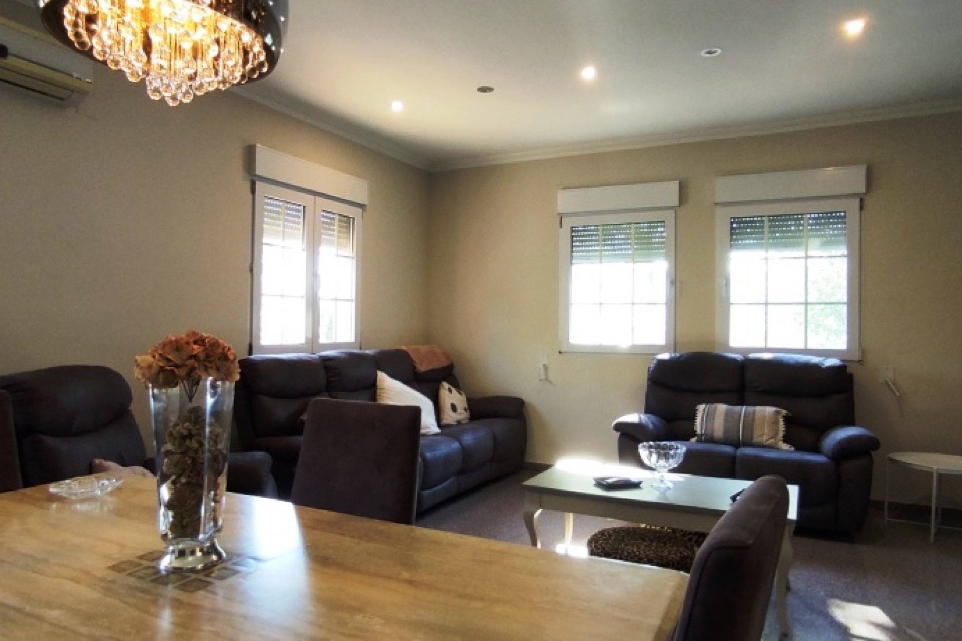 Villa with wonderful panoramic city view, situated within less than 1klm from Alcoy, the nearest town and only 45 minutes from the coast. It is a single storey property in excellent condition having recently been fully redecorated inside and out. It features entrance hall, 2 double bedrooms, a single bedroom, family bathroom, master bedroom with on-suite bath and dressing area;The property has a large lounge / dining room, completed with a nice modern style kitchen, with pantry and utility area. This property benefits of double glazing throughout, fitted wardrobes, has mains water, mains electricity, internet connection, alarm system, air conditioning and central heating. Outdoors the property is complete with a self-contained casita, currently used as a double garage, storeroom, workshop and nice summer kitchen – barbecue overlooking the pool. There is a nice private swimming pool, surrounded with a large solarium and a shower room. Sits within a generous plot of 4,500 m², most of it fully paved. There is an attractive low maintenance garden area around the house with plenty of trees for shade. Excellent location in a slightly elevated position, with stunning views down the valley. This property would make for an ideal family, in this tranquil location with a good road access.